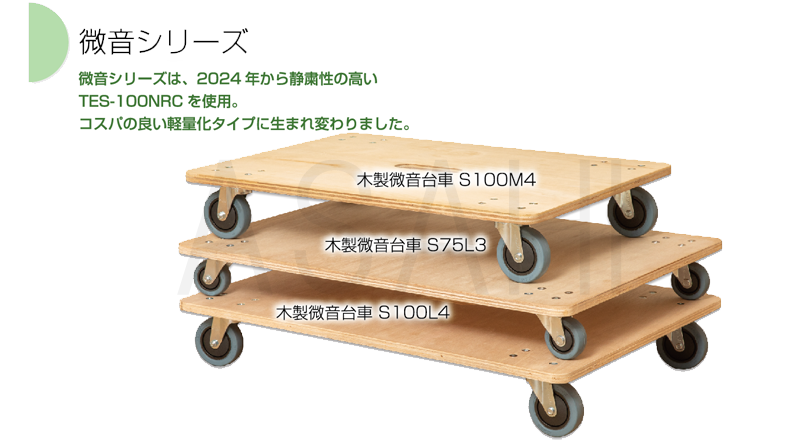 | MDA-S100M4 | 木製微音台車S100M | 200 | 100 | 微音 | 140 | 厚 18×800×550 | 楕円 | 約5.8 | 2台 |