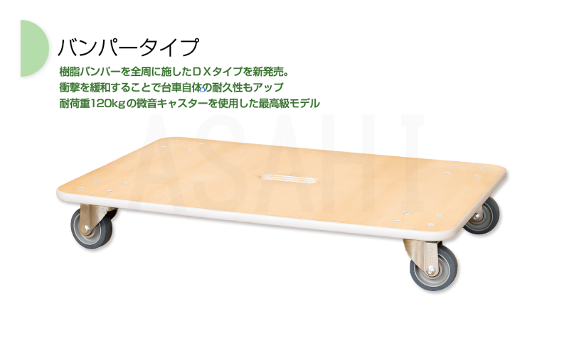 衝撃を緩和することで台車自体の耐久性もアップ。耐荷重120kgの微音キャスターを使用した最高級モデル。
