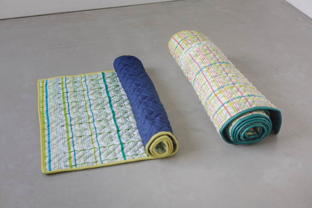 子どもがクレヨンで落書きをしたようなラフな柄とカラフルな緩い線のチェック柄のデザインをシルクスクリーンプリントし、表に見える糸は通常青だが、白に変えて縫製をしていただいた。出来上がった物は今までに見たことのないテキスタイルだった。また丈夫さと利便性を兼ね備えた縫製技術で、細かいゴムのギャザーの入ったフィットカバーの形自体がかっこ良かった!梱包資材とテキスタイルデザインの可能性を肌感覚的に感じた瞬間だった。
