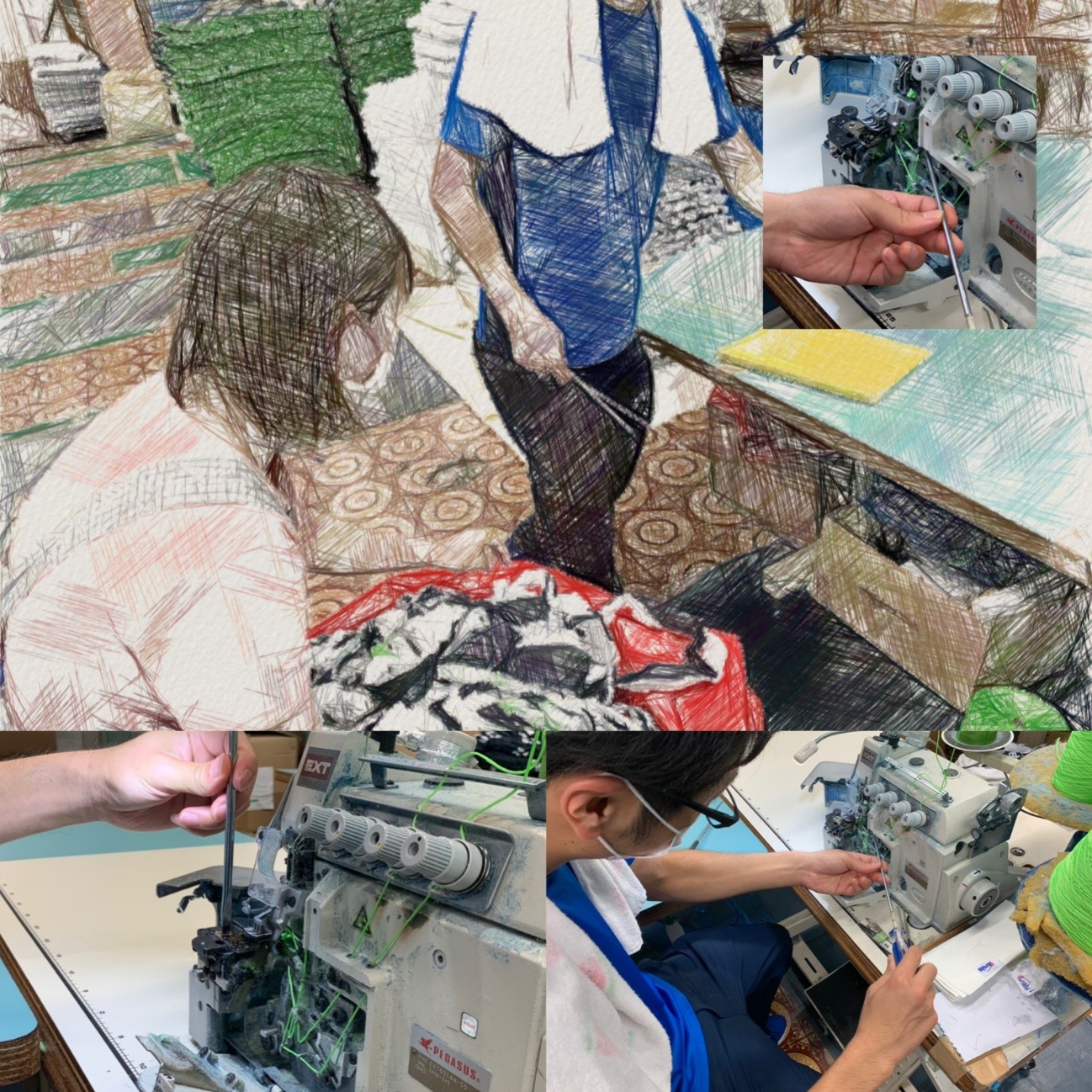 少し前なら、上手くいかずに丸一日調整をしていた時もあり、その時は「無理!だれか代わってくれ!」と心の中で叫びながらメンテナンスをしました。最近ではロックミシンの他にも、バインダーミシン、2本針ミシンのメンテナンスにも携わるようになり、バインダーミシンがずっと調子が悪くミシン屋さんを呼んで講習を受けながら直したときはとても勉強になりました。これからまだまだ腕をあげなければいけないと思いつつ、その成長の記録を今後もアップしていければ、後々入ってくるであろう僕の後継者の一助になるのではと思っています。