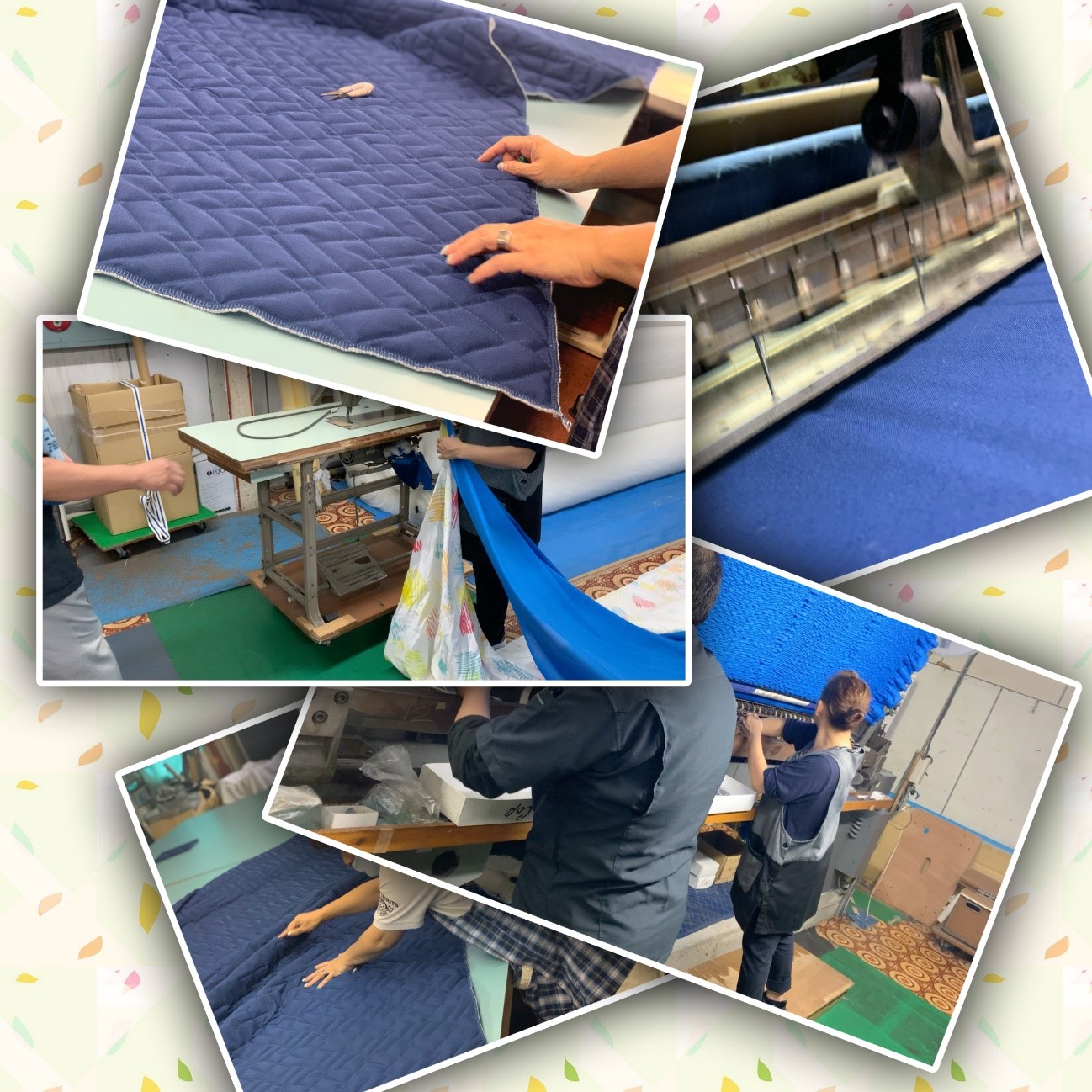 研修は、「生地かけ」からでした。生地かけというのは、長い生地を筒状の芯に巻き付けるために巻きやすいように準備する工程です。消防員がホースを伸ばす用意をするように、生地を準備します。それから「シャトル入れ」ミシンで言う“ボビン”のパーツがキルティングマシンの場合、しずく型の鉄のケースに糸を入れます。そしてようやくキルティングマシンの研修が始まりました。