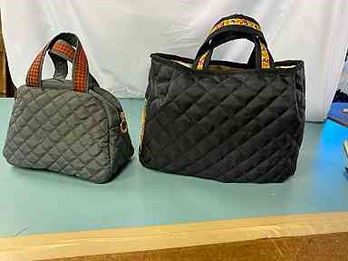 アサヒでは主にシャトルの糸交換の仕事ですが、最近工場の片隅にあるハンパな物を使ってチョットしたバックを作りたいと先輩でもある友人のTさんが思いつき、昼休みの少しの時間で少しずつ始めました。私はまち針を刺し、チクチクとパッチワークをし、キルトの線を書き、綿と裏地を重ねシツケをして、ミシンで縫ってキルトをするのですが・・・なんと大胆なTさんはまち針も使わず、洗濯バサミを2 .3個使ってチャチャっと仕上げていきます。その豪快な姿にビックリすると同時に、アサヒに勤めて培ったキルトの縫製方法と常識が、一般的な飾りキルトの物とは全然違うことに「うれしいカルチャーショック」を受けました。また、流石!30年キャリアのベテラン職人さんの腕前に脱帽でした。