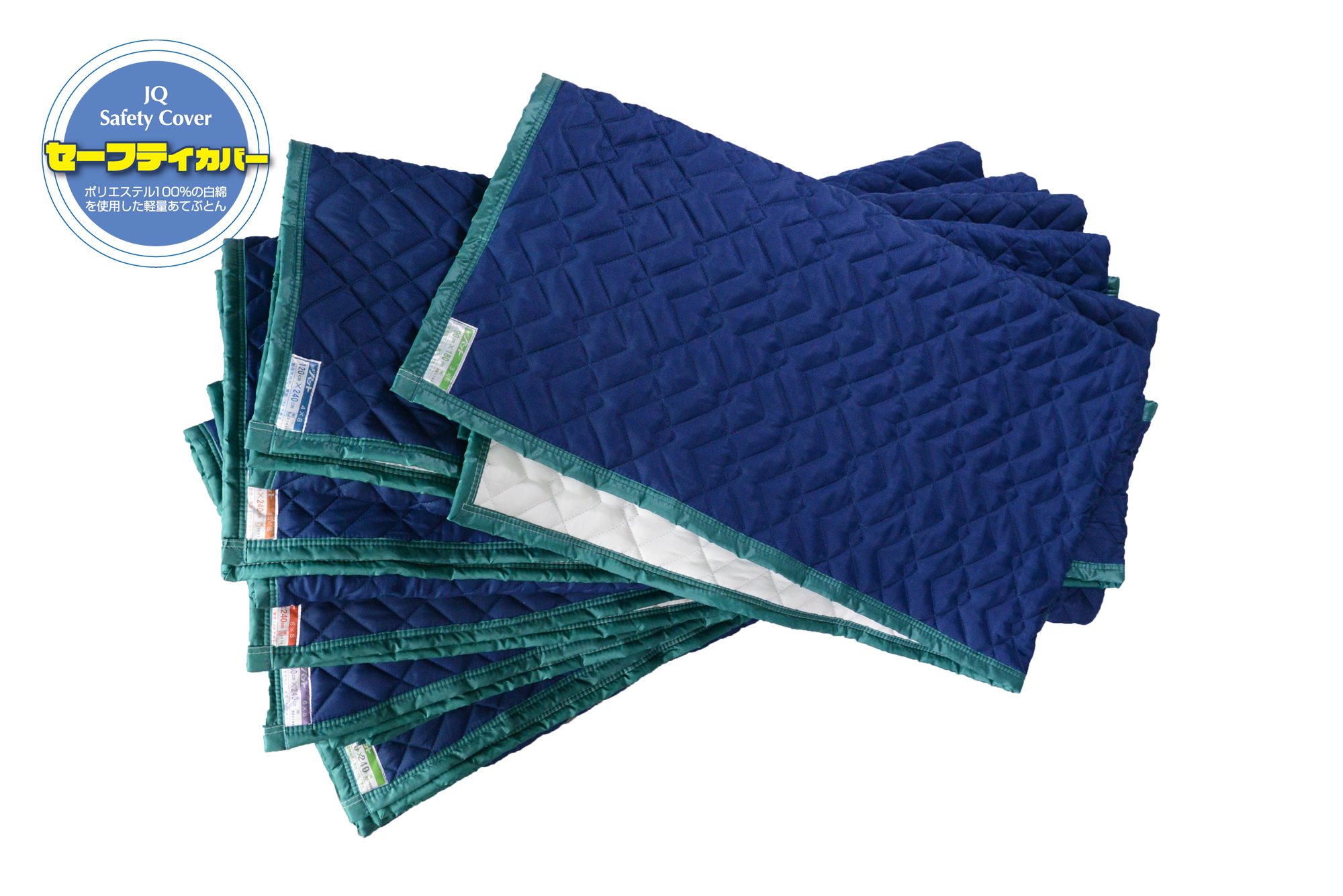 紺色のトロピカル生地に描かれる特殊なキルト柄と、グリーンの縁取の組み合わせが、美観にこだわった「セーフティカバー」の特徴です。