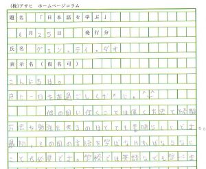 しばらくして、私は新しいスケジュールを作ることに決めました。この決め事を実行する事で着実に力を付けたいです。会社のみなさんにもたくさんのことを熱心に教えてもらっています。沢山ほめてもらいますが、自信を持てるまでにはなっていません。ただ、仕事や勉強が以前よりも楽しくなってきました。これからもっともっと頑張りたいですし、日本に来て本当にたくさんのことを学ぶことができ、その機会を与えてくださったことに感謝してこれからも一生懸命勉強に励みたいと思います。
