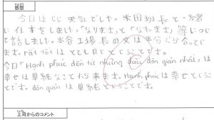 日本に来て学んでみて、ベトナムにいた頃学んだことや理解したことと比べるとそれがあまりに少しに見えて可笑しくなります。まだまだ分からないことだらけですし、間違いすぎるとがっかりします。2年くらいたちますが、学習方法はあまり進歩していないように感じてしまいます。ですが、人の成長はある時急に伸びるというので忍耐強く頑張りたいです。