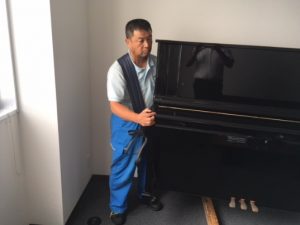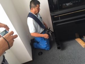 プロのピアノ輸送業者は、この黒い重量物を何と二人でたやすく持ち上げて、傷つけることなく設置してしまいます。使われる資材は「肩なわ」と呼ばれるベルトだけです。まさにプロの神業だと感心してしまいます。