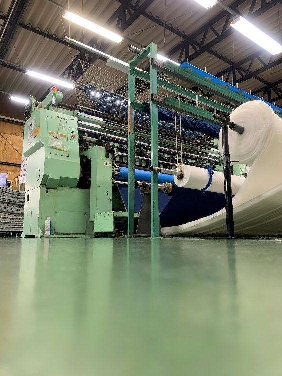 平布団専用機の2台については、規格品の場合はゴムも使用しません。稼働速度も緩やかです。糸の色が表地と保護色で見づらいということ、重みで弛まないように両サイドから引っ張っていなければならないこと以外では特に操作の面で難しいことはありません。が、この2台は平布団ベースのほとんどの特注品に絡んできますので、サイズに合わせた針糸の抜き差しが頻繁に発生します。それだけではなく、不織布をセットしたり、綿の代わりにミラマットを入れてみたりと、まるでロボットアニメの「〇〇バージョンにチェンジ!」みたいなものです。ニューモッコの肩当てに使うターポリンや一部のノンスリップマットもこちらで手掛けることがありますので、5台のマシンの中ではこの2台の役割が一番多いと思います。