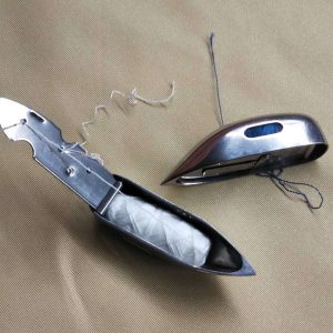 生地と綿をセットして、キルティングマシンをスタートさせてからも「切り替え作業」は続きます。生地幅に合わせて針と糸を足したり減らしたり、注文の内容によっては数10本~最大100本以上ある上糸を全て交換することもあります。更に下糸も生地に合わせた色の糸に交換する場合もあります。下糸は“シャトル”というパーツを使っています。これは通常のミシンで言えばボビンの役割を担っていて、針や上糸の数だけシャトルも使うことになります。シャトルの中身が無くなる度に2名のオペレーターで交換します。100個以上のシャトルでも所要時間は概ね5~6分。ちなみに初心者の場合、10個交換するのに15分以上かかる場合もあります。シャトルをセットする際に、専用の「ホルダー」という細長いパーツを使うのですが、シャトルを乗せるだけで何かに固定する訳ではないので、乗せてから入れるまでの間にシャトルが落下してしまうのです。筆者自身、新人の頃に覚えるのに一番苦労したのがこの作業でした。コツを掴み、現在の速さで出来るようになるまでに、何度も試行錯誤を繰り返した記憶があります。