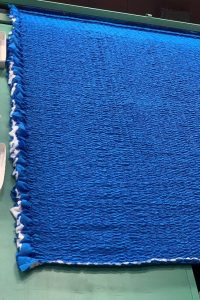 次にノンスリップマットです。表地がパイル、裏地がスリップストップというゴムのシートで出来ています。このスリップストップという裏地、その名の如く本当に滑りません。滑らない素材をキルティングマシンの中に滑り込ませていくという大きな矛盾との闘い。マシンにかかる負担も他の4台よりかなり大きいものになります。その方法は、残念ながらここにも社外秘という壁がありますので具体的には書けませんが、出来上がったノンスリップマットの裏地に皺が寄らないように、2名のオペレーターが両サイドから強く引っ張り続けなければなりません。かなりの重労働になります。