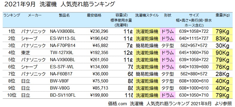 人気売れ筋ランキングベスト10のうち8種類が「洗濯乾燥機」、そのうち6種類が「ドラム式」で、重さの平均は81キロでした。重いものは90キロあります。乾燥機がつかない「洗濯機」は20キロ~30キロと考えると、近年人気の「洗濯乾燥機」は、約3倍の重量になります。