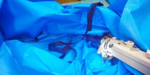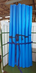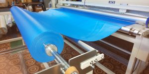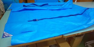 これはブルーシートの100m巻きです。直径20cm超!普通ではなかなか見る機会がないと思います。マットレスカバーの制作にはこの青い丸太の裁断からはじまります。まず、延反機という裁断する機械の台に乗せなければならないのですが、重いです。1本約40kgあるそうです。一度に100枚単位で製作しますが、これに対して100mのブルーシートを約5本使います。実におよそ200kgのブルーシートを相手に、ここから戦いが始まっていると言っても良いでしょう。裁断は一人で行います。裁断の後は縫製です。
