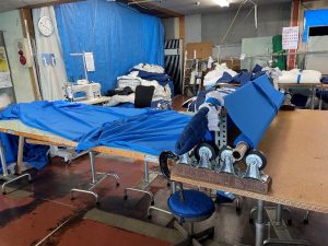 私はアサヒに勤めて5年半くらいになります。キルティングマシンにセットして使う長い生地を縫い合わせる「生地班」で仕事をしています。私なりに結構慣れてきて早く縫えるようになった!と思うのですが、熟練さんを見るとやはり1本の生地(縫い合わせていくと全部で50~60mになる)を縫い終わるまでの速度がすごい!30枚から多い時で60枚弱の生地を縫い合わせて長い生地をつくりますが、一枚縫って、次の一枚をもってきて、重ねてまた高速で直線縫いをする。大事なのはそれぞれの動作の無駄をなくし、出来るだけ短い時間で次を縫うことです。やはり熟練の方は無駄が少なく、新人さんと比べると倍くらいのスピードで1本を縫います。それが経験と年数の積み重ねの成果だと感じています。私も早く先輩方みたいに早くて丁寧で納得いく仕事ができるようになりたいと思います。後は、縫いのミス・・・私たちは「パンク」というのですが、下糸が無くて縫われていなかったりなどの失敗がやはり新人さんや研修中の人は多くなりがちです。熟練してくると音や手触りで違いを察知してミスを未然に防ぐことができるようになるのです。