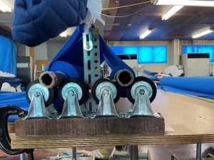 先日、家族で飼っていたミニチュアダックスが亡くなってしまいました。小さいころから今まで元気でいてくれたのですが、人間より年を取るのが早いので、ここ最近は足腰が弱ってきていました。ある日、いつも自分で飛び上がっていたソファーに上がれなくなってしまいました。どうにかしてあげられないかと家族で考えて、スロープを作ってあげてはどうかということになりました。早速日曜大工が得意な私たち夫婦はホームセンターで板を購入しスロープをDIY!そして上りやすいようにと会社で作っているノンスリップマットの余りをもらってきて表面に張り付けました。表はパイルで柔らかく、裏は滑り止めになっている物です。最初は戸惑って登ってくれなかった愛犬も徐々にスロープを使ってソファーに上ってこれるようになりました。今思うと少しの間でも工夫して作ってあげられて本当に良かったと思います。プロツールの丈夫さと品質でペットの為の商品もできるのではないかと思いました。因みに、写真の「開反機(生地を引き出す機械)」も生地班で自作したものです。台車のキャスターを逆にして使っています。