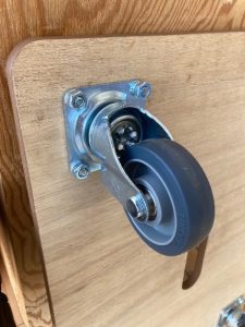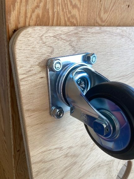使用するボルトはモデルにもよりますが、直径約8mmと10mmの皿ビスで、特に100φキャスター様に使用している直径約10mmのタイプは過去に200Kg以上もあるピアノ等の重量物を輸送する場合で使用した際、片側を浮かした2輪だけの状態でも取り付け部の強度が保たれるほどの強度の高い実績のあるネジです。