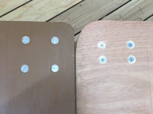 安価なやわらかい輸入ユーカリ材より腐食しにくく高負荷に耐えうるもので、18mm厚の場合は9mm厚の板を2枚貼り合わせしており、単に1枚物の板より表裏それぞれの面に良質な板面が良いとこ取りで使用できるよう工夫されています。