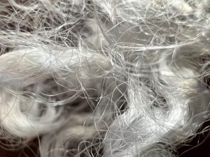 また、安定した品質を維持しているのは、国内の半毛工場により加工されたウーリー半毛です。長くお付き合いしている半毛工場さんが細心の注意を払って、白い糸のみをより集めて、ガーネットという製綿機のお化けのように大きな半毛機械にかけて作っています。