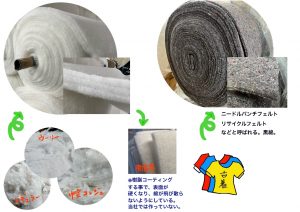 当社の使用する綿は「ポリエステル綿」で、カード成型によるロール綿です。特徴としては白く軽く且つ弾力性があります。キルトに使用される綿の種類はこのほかにも「黒綿」や「硬綿」などがあります。「黒綿」はリサイクルフェルトといわれ、古着などを解繊してニードルパンチしたもので、黒っぽく重いですが、干渉性は高いです。当社も自社製造していませんが、ピアノ用の当て材など重量のあるものに当てる養生材には使用しています。「硬綿」は、ポリエステル綿の表面に樹脂を塗布して固めたものです。移動などをしても綿の飛散がない安定した形状を保つことができます。ただし、黒綿は製造する場所がものすごい量のホコリにまみれてしまいます。また、樹脂綿を作るとべたべたの樹脂が機械中につくことになります。
