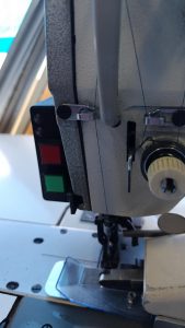 このミシンは、布端をセンサーで感知し、上下の生地を正確に制御して縫い代を一定に保ちながら縫い上げるのが特徴です。ミシンのボタンを押すことで縫い始め、センサーがあるので、2枚の生地がずれたりすると自動で止まります。ずれないかぎりは端から端まで緑のボタンを押したらミシンは止まらず縫い続けます。緑のボタンをまた押せば一時停止はできますが、いちいち止まっていたのではこれまた作業効率が悪いです。(写真2)縫うスピードがとても速いので、2枚の生地を常に揃え、一気に端から端まで縫うのがコツがいり大変です。また、このミシンは立ち縫いミシンで1日中立って縫うので、1日の終わりには足がパンパンで棒のようになり、とても大変だったのを記憶しています。今はこのミシンは故障をして別の座って縫えるミシンに変わっていますが、縫製工場だからこそ経験できたミシンなので、貴重だったと思います。生地縫いは約10年やっていたので、現時点では一番長く付き合った相棒と言えたでしょう。
